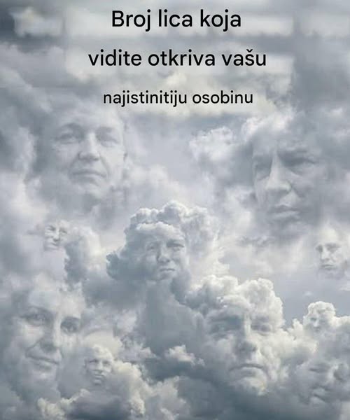 Vizuelni test se sastoji od jednostavnog zadatka: posmatrajte oblake i prebrojite lica koja vidite. Vaš odgovor može mnogo reći o vašoj ličnosti i načinu gledanja na svet. Na primer, ako primetite samo jedno do tri lica, to može ukazivati na to da ste fokusirani i prizemljeni. Ove osobe su često praktične, sklone donošenju odluka zasnovanih na racionalnim argumentima i realnim konstatacijama, bez previše komplikovanja. Oni se lako prilagođavaju svakodnevnim izazovima i ne gube se u maštanjima, što im pomaže da ostanu usredsređeni na svoje ciljeve.