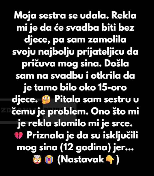 Međutim, kada sam stigao na svadbu, dočekalo me je iznenađenje koje nisam mogao ni zamisliti. U dvorani je bilo mnogo djece, vjerovatno oko 15. Bio sam zbunjen i pomalo ljut, jer me sestra bila obavijestila da će svadba biti bez njih. U tom trenutku, razmišljao sam o mogućim razlozima za ovu promjenu. Da li je u pitanju bio pritisak drugih članova porodice ili prijatelja? Da li je možda sestra smatrao da će prisustvo djece na proslavi dodati više radosti tim posebnim trenucima? Pomislio sam da je možda u pitanju nesporazum, pa sam odlučio da sačekam da je vidim i razgovaram s njom. Kada mi je prišla, nisam mogao ni pretpostaviti koliko će me njen odgovor povrijediti.