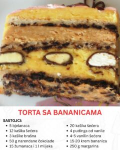 Poseban detalj koji ovu tortu izdvaja od drugih jeste dodatak krem bananica. One se ne ubacuju tek usput, već imaju svoju važnu ulogu u cjelokupnom doživljaju. Kada se rasporede između slojeva, donose ne samo dodatnu slatkoću, već i zanimljivu teksturu. Njihova mekoća u kombinaciji sa kremom i korama stvara kontrast koji svaki zalogaj čini posebnim. Upravo taj spoj čini ovu tortu nezaboravnom i drugačijom od klasičnih kolača.