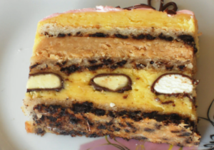 Dok se kore hlade, pažnja se prebacuje na prvi sloj fila koji donosi stabilnost i dodatnu punoću ukusa. Mljeveni keks, natopljen sokom od narandže, dobija novu dimenziju svježine i blage citrusne note. Kada se sjedini sa umućenim margarinom, nastaje masa koja nije samo ukusna, već i dovoljno čvrsta da drži tortu na okupu. Ovaj sloj je važan jer povezuje sve elemente i daje torti potrebnu strukturu.